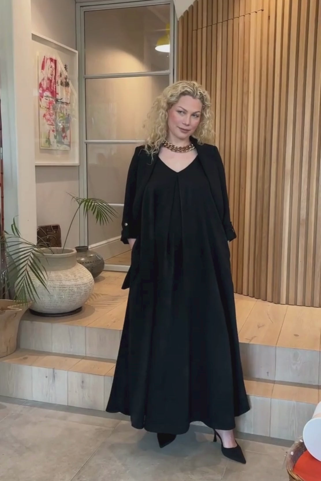 This is the perfect modern black dress style for a capsule wardrobe, offering the versatility to wear as a smart maternity workwear dress or easily styled up for evenings or events. Postpartum, this is a wonderful dress with a flattering drape – working well on all body shapes and sizes.